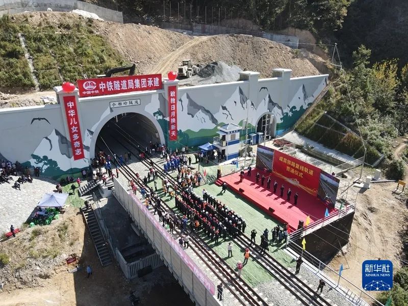 这是10月28日在四川省凉山彝族自治州喜德县小相岭隧道口拍摄的成昆铁路复线轨道贯通仪式(无人机照片)图源:新华社