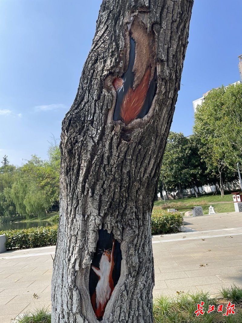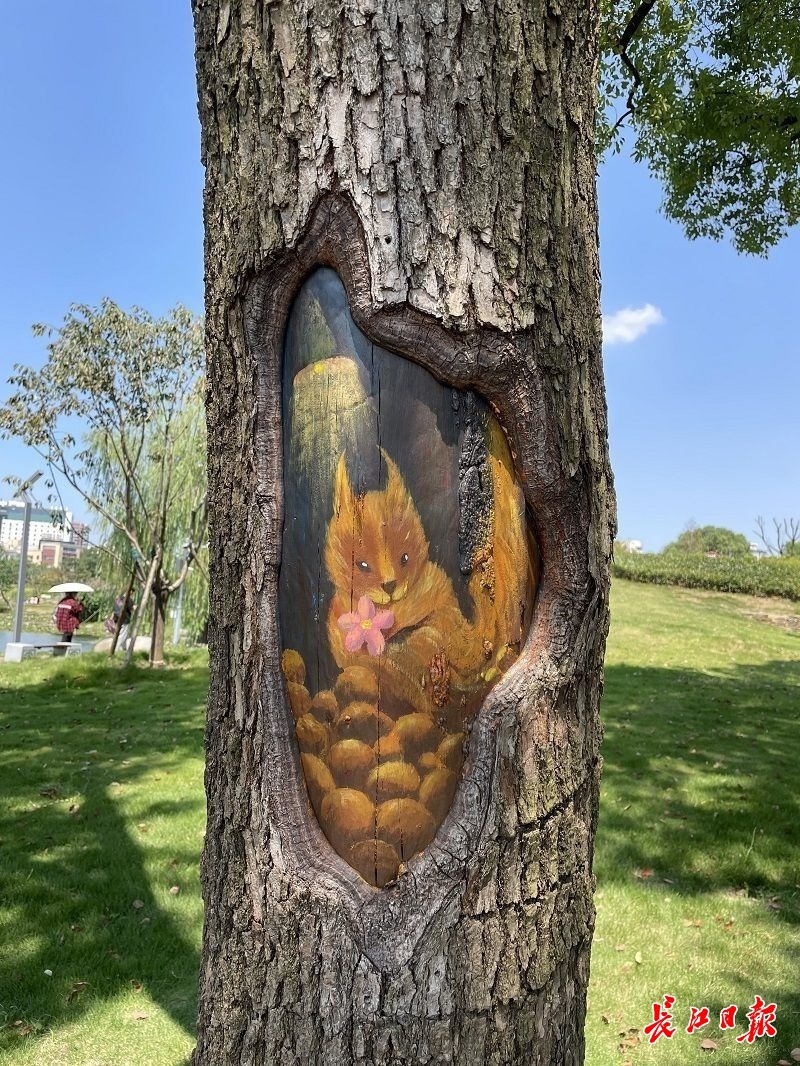 长江日报记者在紫阳公园内看到,这些被装扮的大树,都是一些树干有破损的,破损大小形状不一。上面的卡通画有小熊、兔子、机器猫、蝴蝶、猫头鹰、松鼠等等,每一幅卡通画给记者的感觉都和环境很契合。