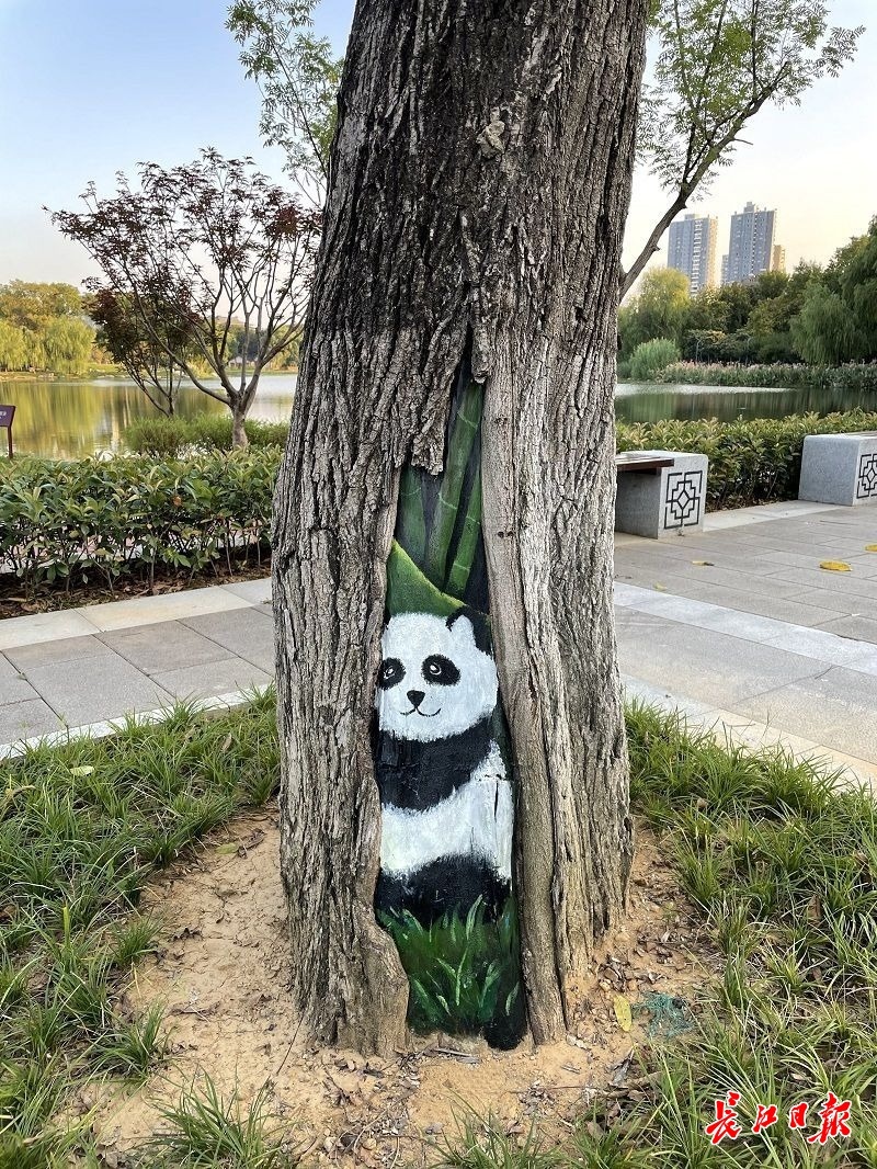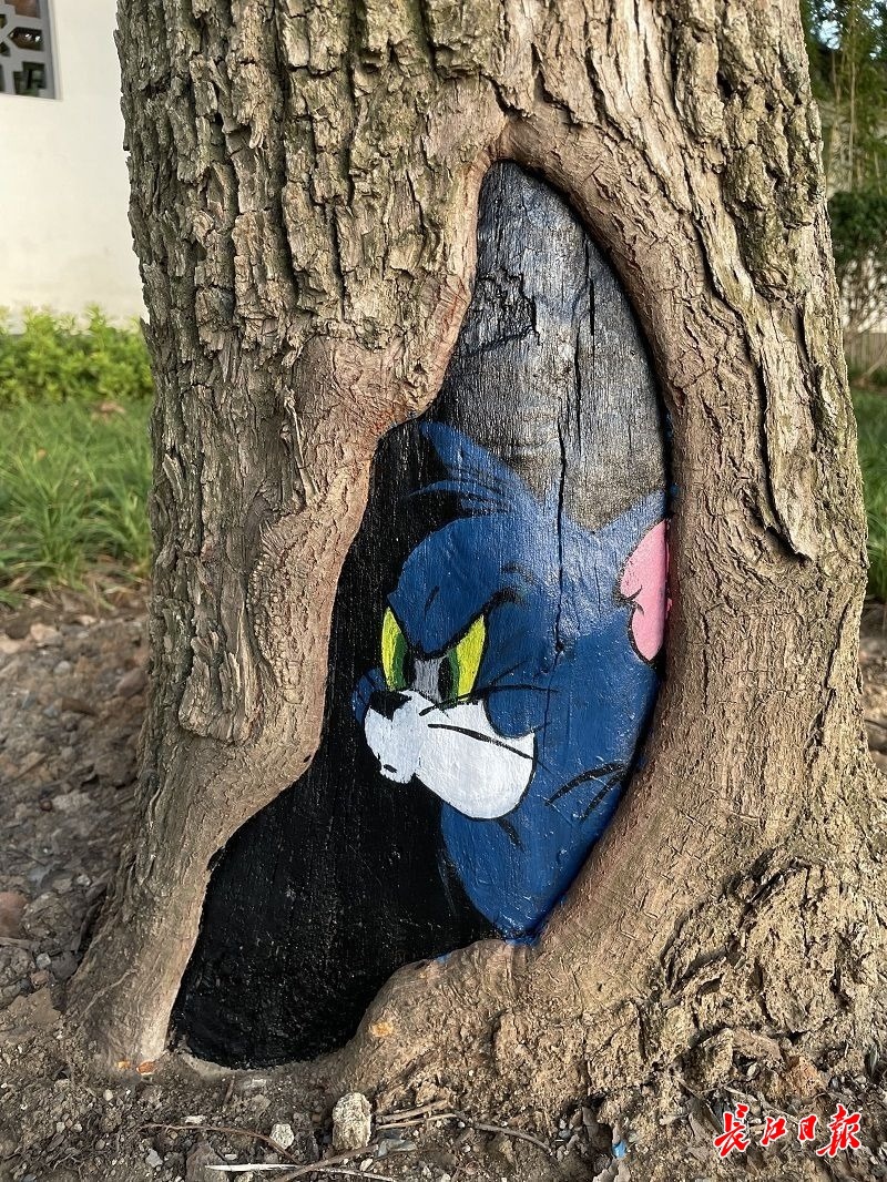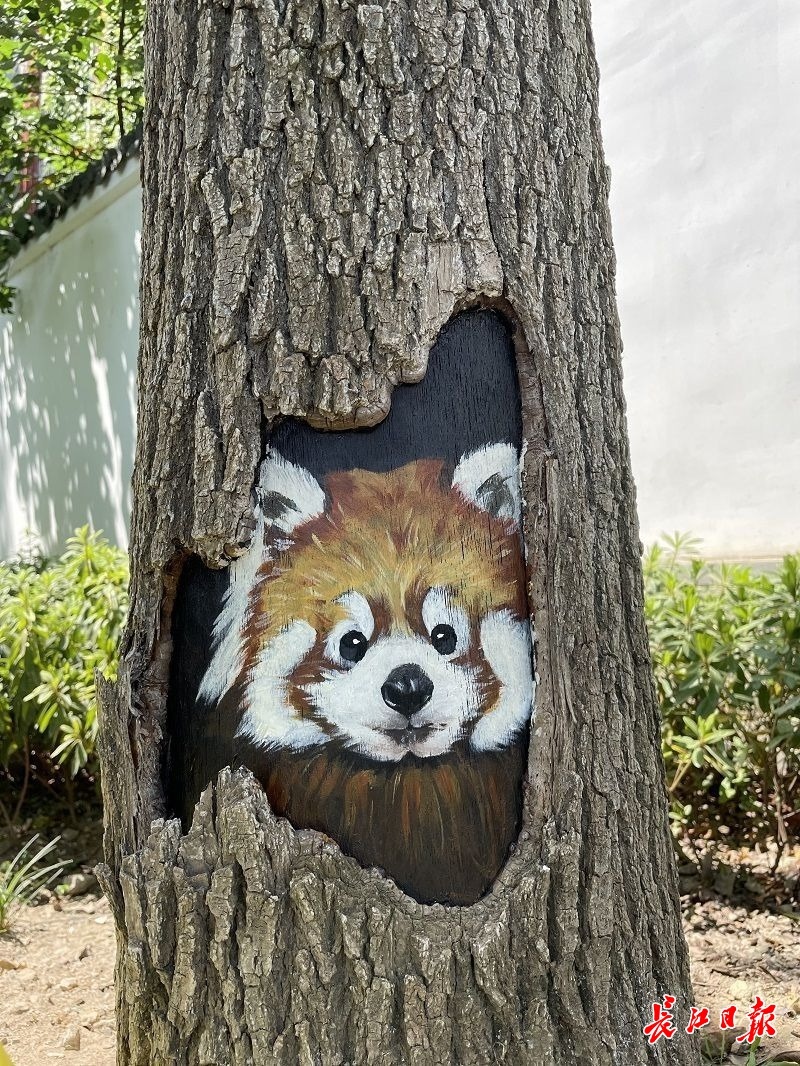 记者联系上为这些树装扮的公园工作人员谢安。谢安去年从湖北第二师范学院毕业后到紫阳公园工作,之前学习的动漫专业。她说,得知公园有这个创意后,她主动请缨,希望发挥自己的特长,让公园变得更美。“耗材都是公园提供的,我则根据破损树洞大小、形状还有周边环境进行创作,创意被通过后,就会选择合适的时候开始绘画,从筹备到最后完成,大约花了一个月时间。”