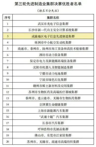 红星新闻消息,近日,工业和信息化部《第三轮先进制造业集群决赛优胜者名单》公示期结束,全国共20个集群成为第三轮先进制造业集群决赛优胜者,其中,成渝地区电子信息先进制造集群正式入围,成为“国家级”先进制造业集群。工信部的先进制造业集群竞赛被业内认为是“国家队”选拔赛,能在这场高手云集的对决中脱颖而出的“选手”,代表了国内产业集群的最高水准。统计数据显示,2021年,成渝地区电子信息先进制造集群规模达到1.6万亿元,占全国比重9.2%、相比2016年提高1.6个百分点,从业人员98.2万人、占全国比重8.9%,成渝地区已成为中国大陆第三、全球前十电子信息制造业聚集地。