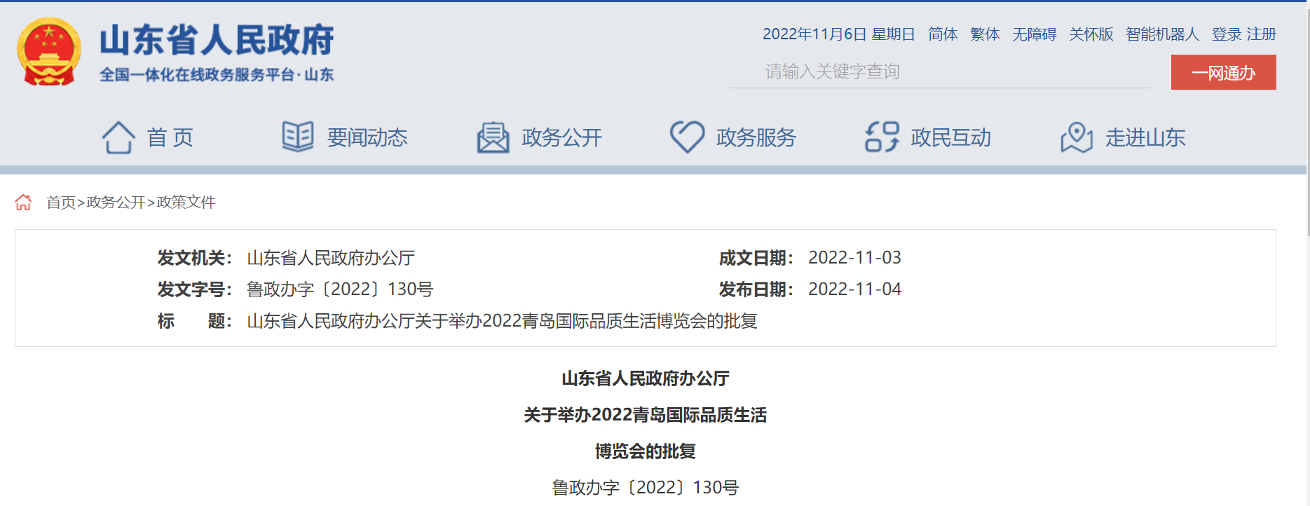 青岛日报社/观海新闻11月6日讯 近日,山东省人民政府网站发布山东省人民政府办公厅关于举办2022青岛国际品质生活博览会的批复,同意于2022年11月18日至20日在青岛市举办2022青岛国际品质生活博览会。