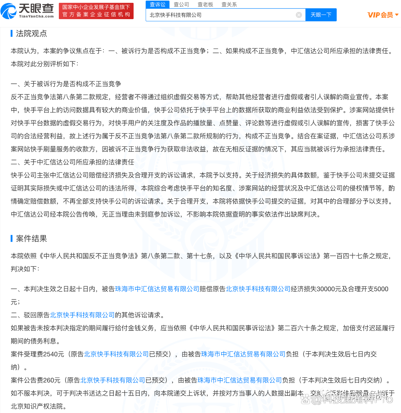 北京市海淀区人民法院一审认为涉案网站提供针对快手平台数据的虚假交易行为,对快手用户关注度及作品的播放量、点赞量、评论数等进行虚假或引人误解的宣传,损害快手公司合法经营利益,构成不正当竞争,中汇信达公司系涉案网站快手刷量服务的收款方,因被诉不正当竞争行为获取非法收益,应当就被诉行为承担法律责任,不久前一审作出上述判令。