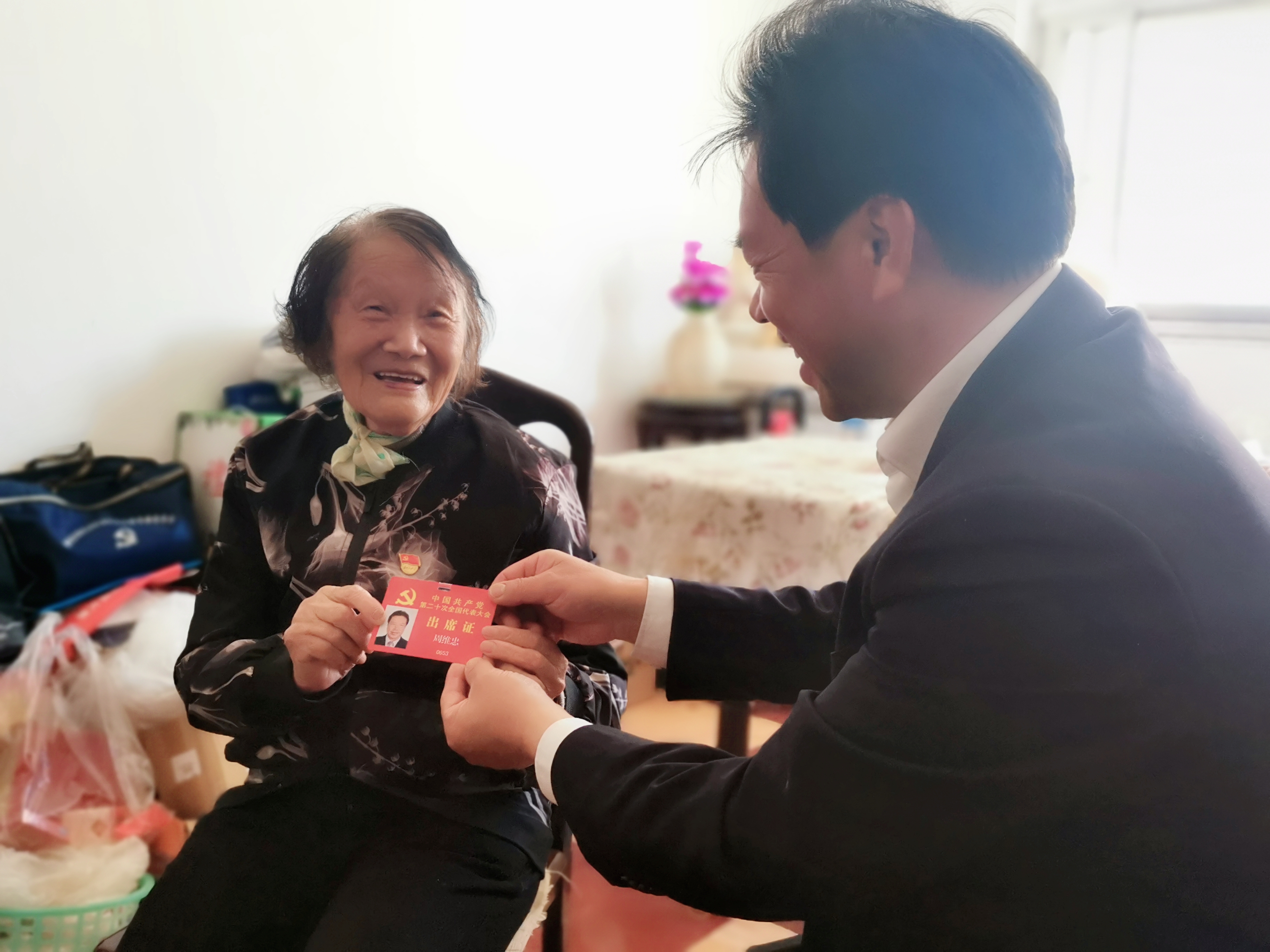 熊妈妈早早在家等着,还特地在胸前别上了鲜红的党徽。周维忠一进门熊妈妈满脸欢喜地迎上前,她告诉周维忠,二十大期间,自己每天都收看电视上的新闻报道,她开玩笑地说,“你在北京开会,我天天看你们开会的时间也不比你少呢!”