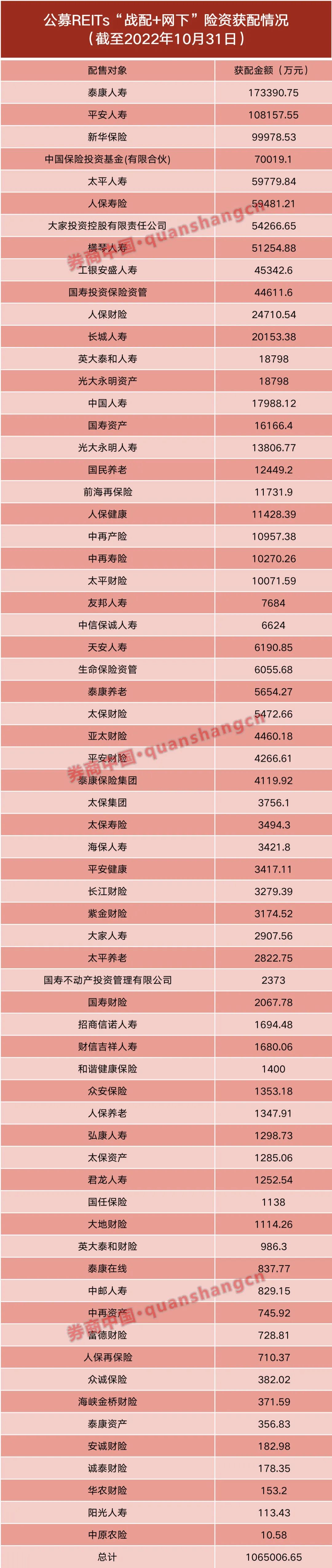 据券商中国记者统计,目前共计66家保险公司的资金成功参与了21只公募REITs的战略配售和网下发行环节,获配金额共计106.5亿元。