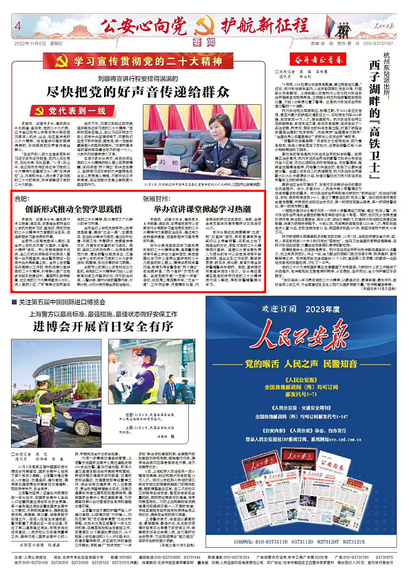 甘州分局依托英模精神“三进”和“云宣讲”活动,积极邀请荣获省部级以上荣誉民警,采取线上线下相结合的方式,积极对党的二十大精神进行宣讲。组建以分局主要负责人为团长的甘州公安党员领导干部宣讲团,结合业务工作实际,解读新思想、新观点、新论断,教育引导全体民警辅警深学细研。目前,宣讲团已开展宣讲活动4场次。该分局还邀请区委党校讲师对党的二十大精神进行深入解读,帮助民警辅警强化学习。