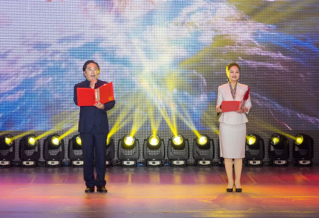 扬州大学党委书记焦新安和扬州市委常委、宣传部部长张长金为获奖者代表、本次主题诗歌大赛一等奖获得者曹利民女士颁奖