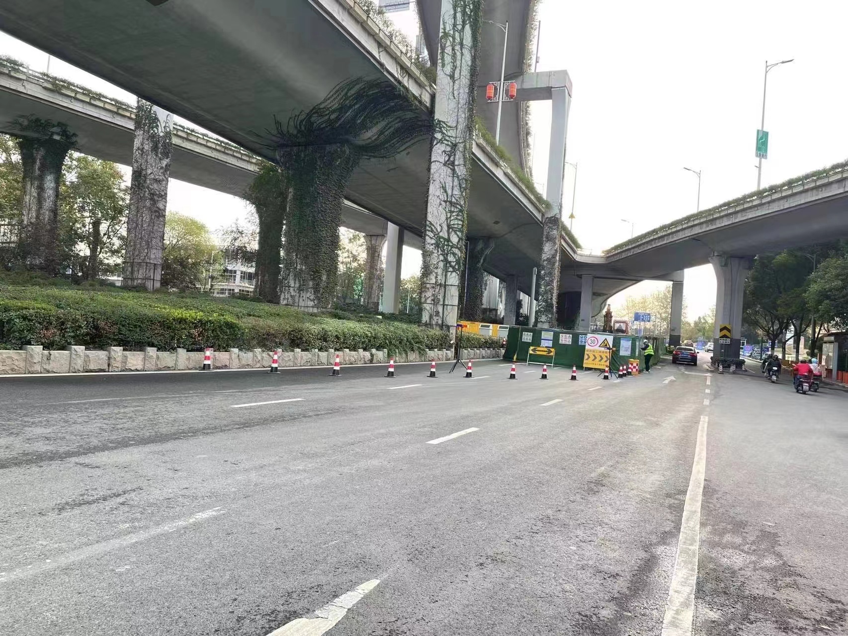 由于该项目由于地处南京市中心,施工路段人流量大,靠近高架立交桥,施工过程中需要统筹兼顾的问题较多,既要考虑交通疏导、居民出行,又要保证文明施工、扬尘管控。因此,施工单位前期进行了大量排查和对接工作,优化施工方案、分段部署施工、合理组织人员和机械设备,将施工影响降至最低的同时,保证施工质量、施工安全及施工工期。