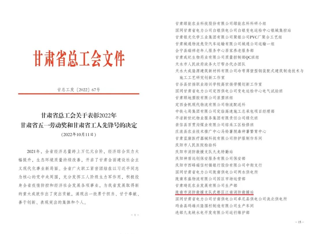 近日,甘肃省总工会印发了《关于表彰2022年甘肃省五一劳动奖和甘肃省工人先锋号的决定》,对在全省疫情防控和经济社会发展中作出重大贡献,涌现出的一批勇于担当、甘于奉献、善于创新、表现突出的集体和个人进行了表彰,其中,授予陇南市武都区江南消防救援站“甘肃省工人先锋号”。