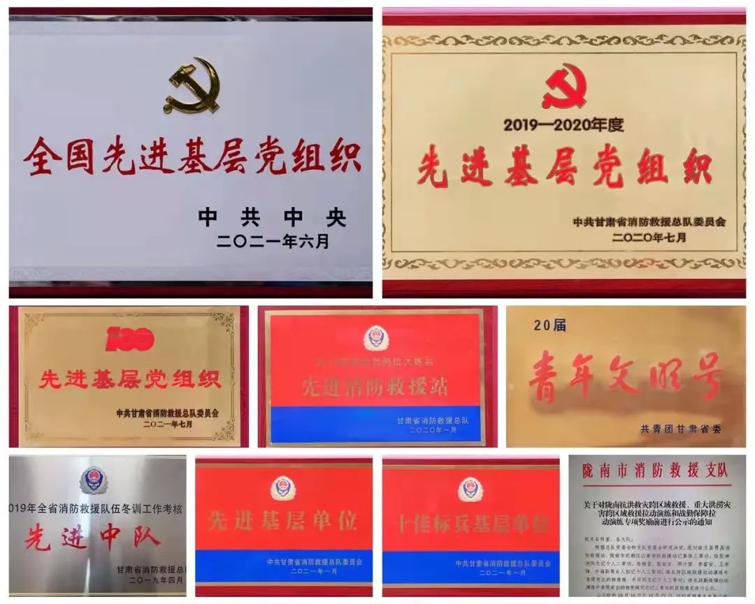 2020年8月中下旬,陇南地区发生百年未遇特大暴洪,41万人受灾,身处灾区的他们夜以继日地奋战抗洪一线32天!面对齐腰深的洪水,毫不退缩,奋勇救人,在暴雨中 、在淤泥里、在长时间浑浊的洪水浸泡中,党员们满是泥浆的救援服湿透了,靠体温烘干,双脚泡的发白肿胀了,磕绊受伤发炎化脓了,不下火线,没有一人提出休息。在持续近一个月的救援行动中,累计营救受困者180人,疏散群众1.2万余人,抢救各类财产价值达6300万余元。不止这一次,在各类重大灾害事故面前,全体救援人员勇挑主力军、国家队重任,不畏艰险、冲锋在前,出色完成“5·12”汶川地震救援、“8·7”舟曲泥石流灾害救援、“3·2”甘南迭部特大森林火灾扑救、“8·8”九寨沟地震救援、2018年“7·10”陇南暴洪灾害和2020年“8.17”陇南特大暴洪灾害。