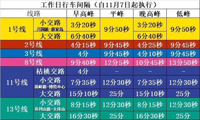 11号线工作日平峰苗岭路-博览中心区段行车间隔调整为12分30秒,博览中心-钱谷山区段行车间隔调整为25分。