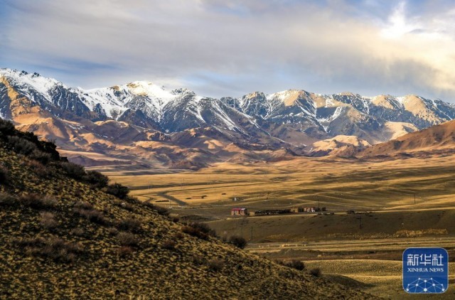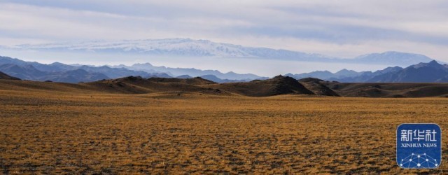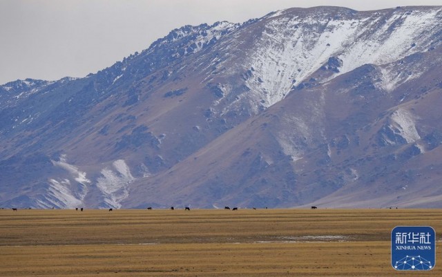 新疆裕民县巴尔鲁克山冬季牧场,远山覆雪,牧草秋黄(11月4日摄)。新华社发(陈双喜 摄)