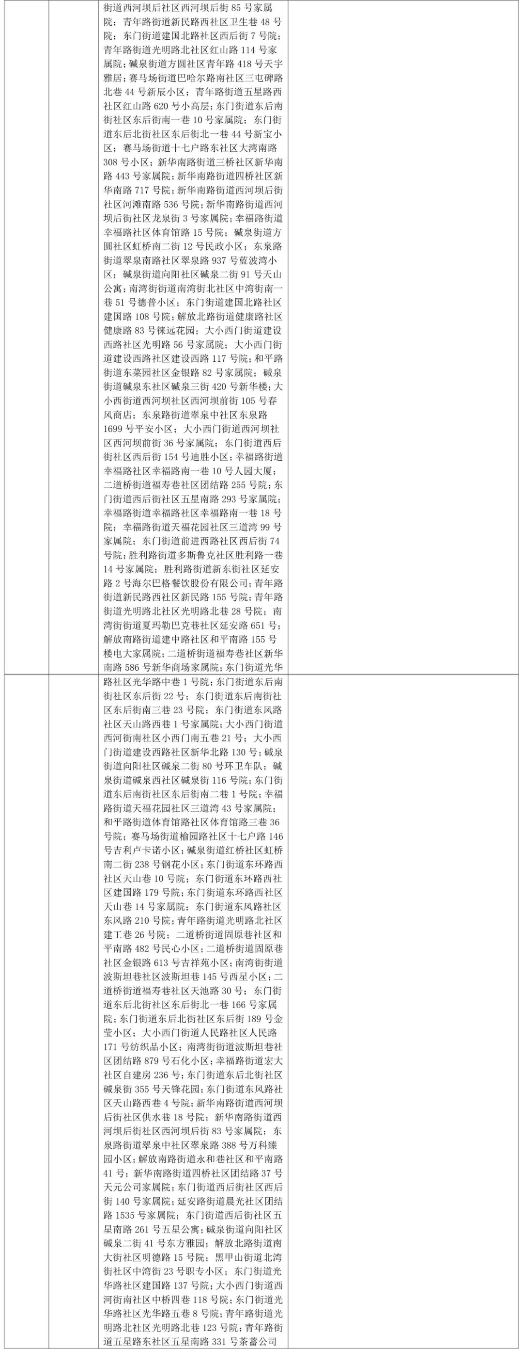 嘉和园一期(劼人路143号)、老邻居连锁(川师店)、QY造型(劼人路41号)、花串串(川师店)、吉壳壳便利店、惠民超市(上沙河铺街店)、奥特乐(华宇广场店)、成都北站智选假日酒店、太平园路51号物资仓库、中国石化建业加油加气站(金兴南路1号)、红牌楼路399号核酸采样点、CVS乐站便利屋(成都东站东广场内)、成都东站二楼候车大厅B12/13至B20/21检票口后面休息区、6号厕所(邛崃山路333号)