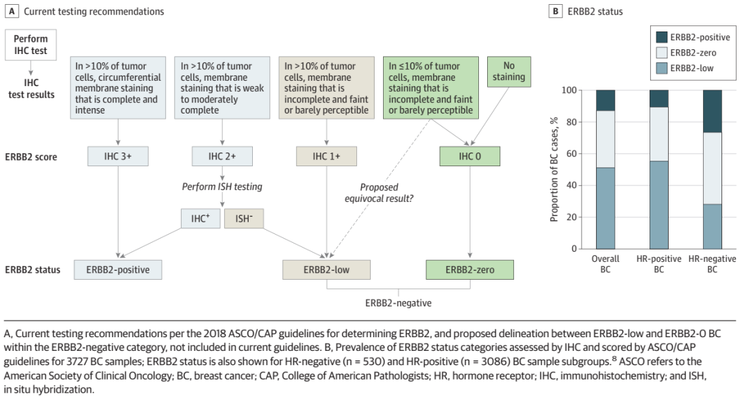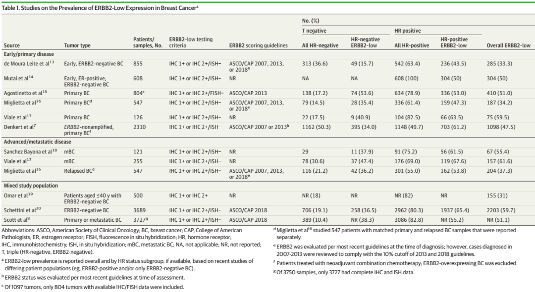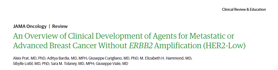 近期发表在《美国医学会杂志》(The Journal of the American Medical Association,JAMA)上的一篇报道“An Overview of Clinical Development of Agents for Metastatic or Advanced Breast Cancer Without ERBB2 Amplification(HER2-Low)”,全面综述了HER2-low乳腺癌的流行病学、生物学特征、诊断技术、治疗进展以及未来探索方向等内容,为更好的了解HER2-low乳腺癌提示了重要方向。