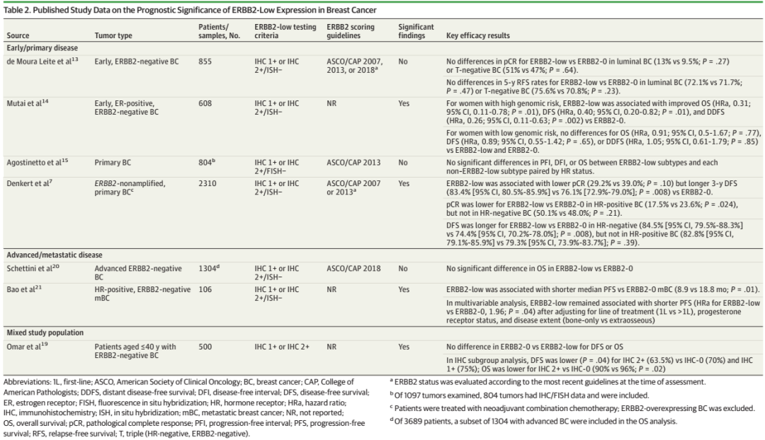 目前关于HER2-low预后意义的报道结果不一,例如一项纳入2310例HER2未扩增乳腺癌患者的研究表明,HER2-low相比HER2-0的病理学完全缓解(pCR)率更低(29.2%vs 39.0%;P=0.10),但3年无病生存(DFS)率更高(83.4%vs 76.1%;P=0.008)。亚组分析显示,尽管HR阳性乳腺癌中HER2-low的pCR率低于HER2-0组(17.5%vs 23.6%;P=0.024),但在HR阴性乳腺癌中确不是如此(50.1%vs 48.0%;P=0.21)。在DFS获益方面,HR阴性患者中HER2-low组的DFS相比HER2-0组显著更长(84.5%vs 74.4%;P=0.008),但HR阳性乳腺癌患者却无显著差异(82.8%vs 79.3%;P=0.39)。另外一项纳入了1304例HER2阴性晚期乳腺癌患者的研究中,HER2-low相比HER2-0组的OS无显著差异。而另一项纳入500例40岁及以下患者的研究中,尽管总体人群中HER2-low和HER2阴性组之间未观察到DFS或OS的差异,但在IHC亚组分析中,HER2 IHC 2+/ISH-组的DFS(63.5%)率显著低于HER2-0(70%)和HER2 IHC 1+(75%)乳腺癌组(p=0.04)。并且HER2 IHC 2+/ISH-组相比IHC-0组的OS更低(90%vs 96%,p=0.02)。