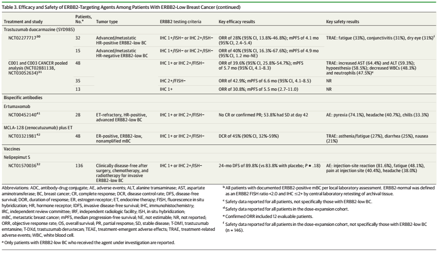 一项II期临床试验旨在评估帕妥珠单抗在既往接受过治疗的传统意义上的HER2阴性乳腺癌(FISH−和IHC-0、1+或2+)中的疗效和安全性,但是该研究中观察到的疗效有限,疾病稳定(SD)的持续时间较短。