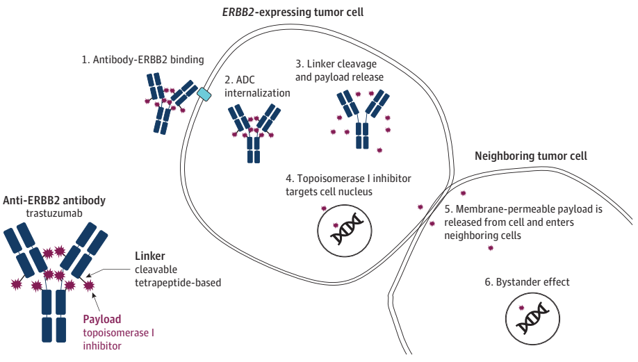 上一代ADC药物T-DM1在HER2-low乳腺癌中的疗效相比在HER2阳性乳腺癌中更差,这在TDM4258g和TDM4374g等临床试验中已经得到了证实。但是新型ADC药物却在HER2-low乳腺癌中显示出明显疗效,这可能与新型ADC药物的旁观者效应有关。