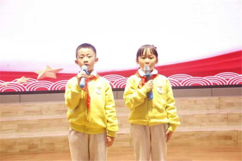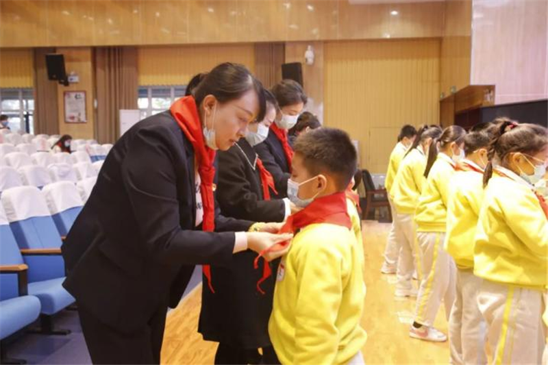 大队委员会宣读新队员名单,党员代表、优秀教师代表、少先队员代表为新队员佩戴红领巾。