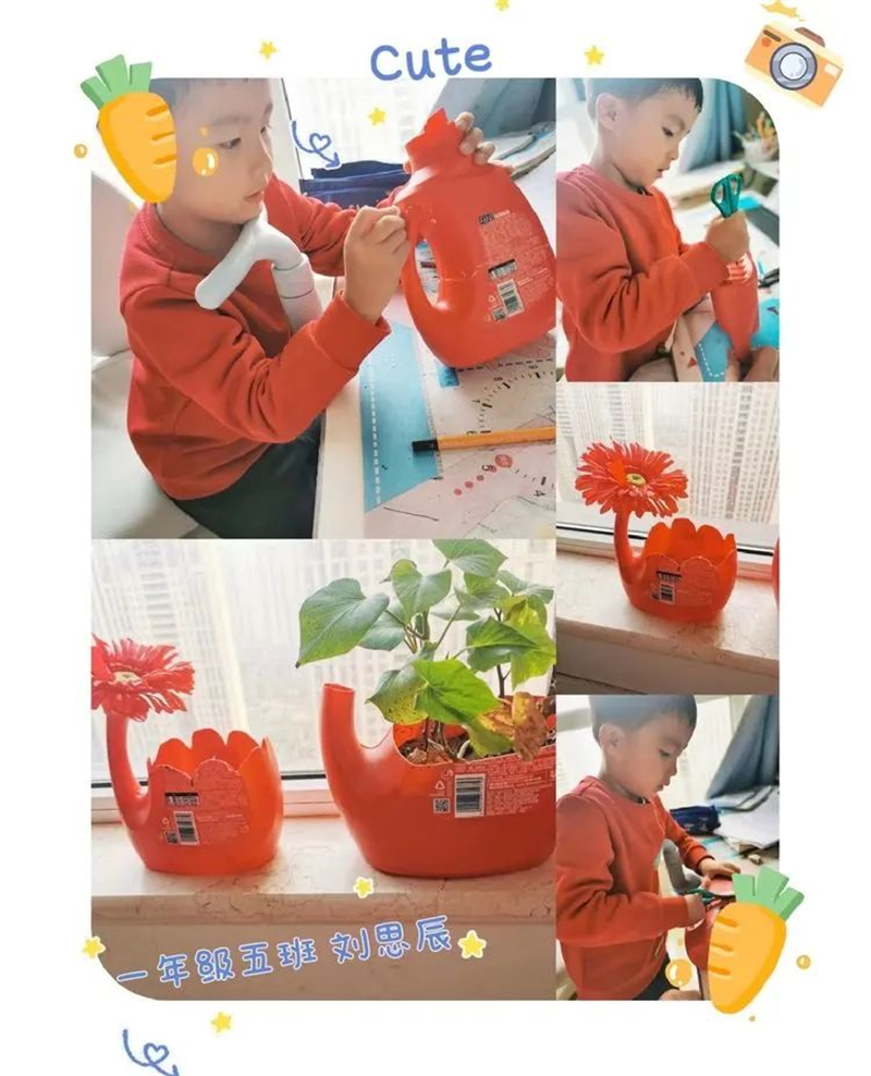 洗衣液瓶子在学生的精雕细琢下变成一个漂亮的花盆。