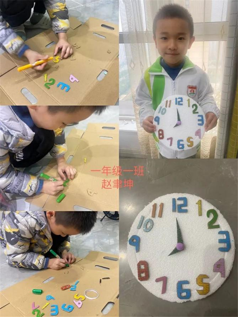 学生用泡沫盖子做表盘,用废弃纸箱裁剪出标准数字,调试好指针,制作出钟表。