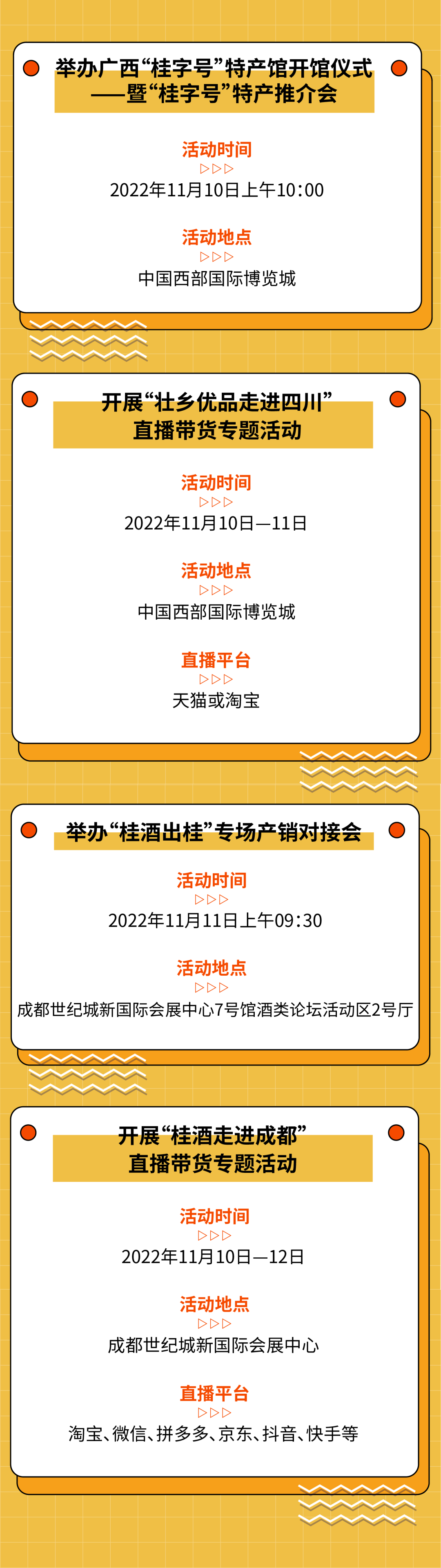 广西“桂字号”特产馆:面积达357平方米,位于成都中国西部国际博览城10号馆C区,汇集了广西十四个设区市的名特优产品,“一站式”吃遍广西美食。