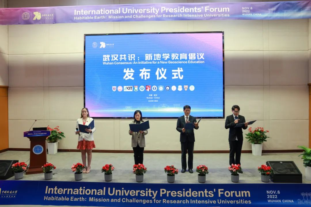 最后,中外大学校长围绕大会主题,探讨了新时代研究型大学的使命与挑战,以及如何构建人与自然和谐共生,实现共同发展。在参会的中外大学校长和与会嘉宾的共同见证下,论坛发布《武汉共识:新地学教育倡议》,倡议中外大学进一步加强国际合作与交流,立足学科交叉与科技创新,充分承担起推动全球可持续发展的大学责任,共创美好未来。