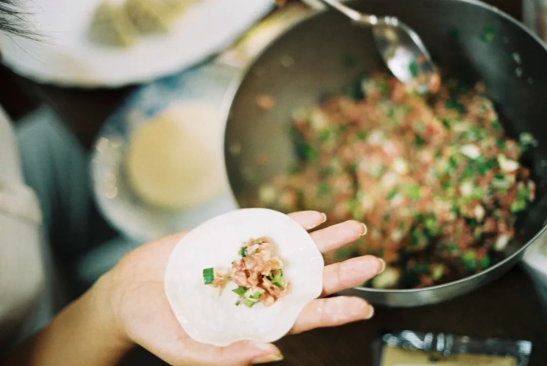 通常做包子、饺子的肉馅都要打进一些水,以便使肉馅软滑口感好,即用清汤或花椒泡的水,向着一个方向搅,搅到“上劲”馅料成团不散。但韭菜馅的就不要打水了,水分很多,又没有挤水的可能,所以肉馅中就不用打水了。