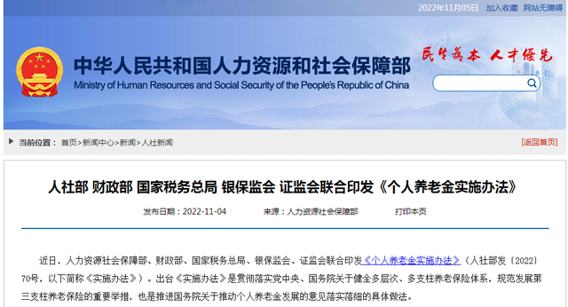 近日,人力资源社会保障部、财政部、国家税务总局、银保监会、证监会联合印发《个人养老金实施办法》(人社部发〔2022〕70号,以下简称《实施办法》)。出台《实施办法》是贯彻落实党中央、国务院关于健全多层次、多支柱养老保险体系,规范发展第三支柱养老保险的重要举措,也是推进国务院关于推动个人养老金发展的意见落实落细的具体做法。