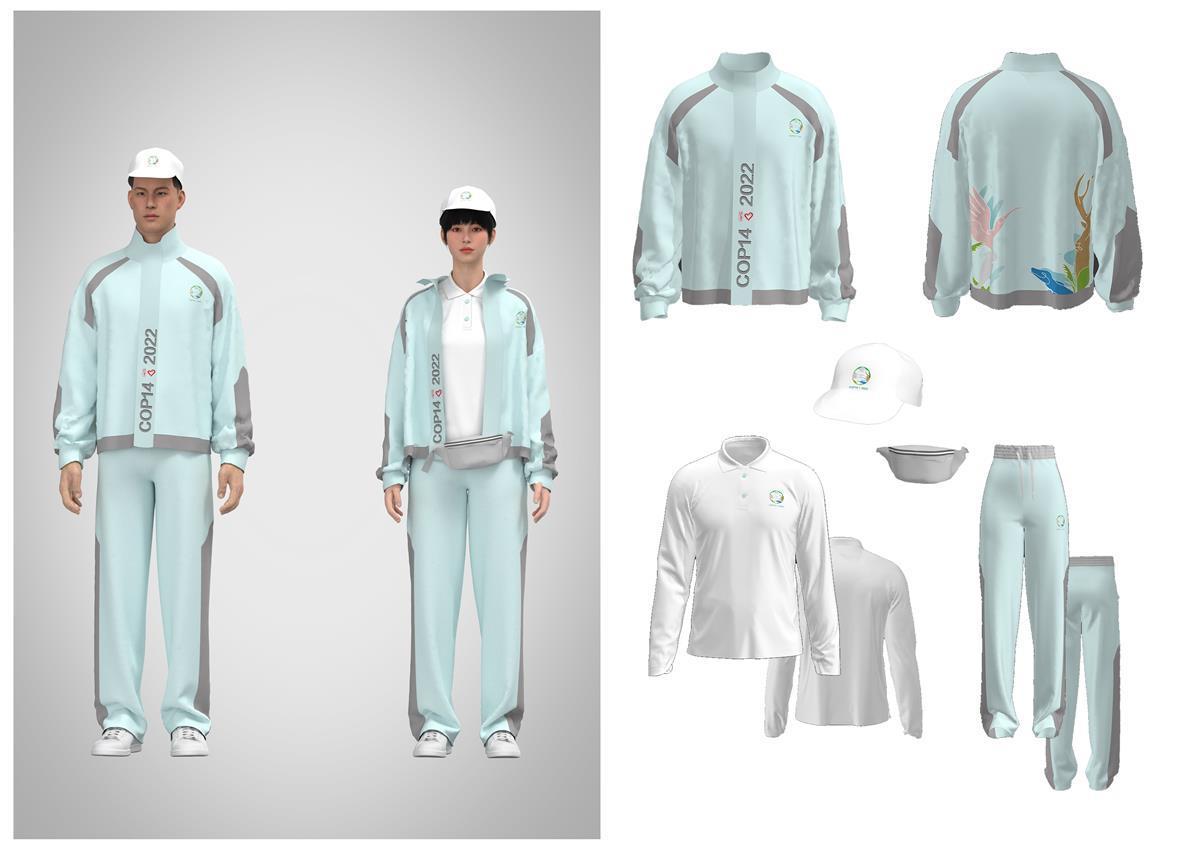 服装后片下端,从本次大会主视觉中提取元素,进行服饰图案再设计与装饰,将湿地生态环境与生物群落的动态美艺术化地体现在服装上。本次大会英文主题Wetlands Action for People and Nature(珍爱湿地,人与自然和谐共生)体现在服饰右边袖片与裤片饰边处,不对称设计更具时尚感。