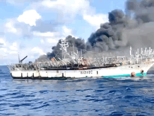 一艘台湾籍钓船“祥庆号”正在燃烧