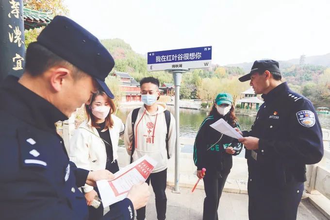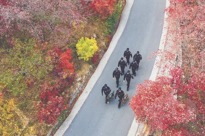为维护好景区秩序,10月25日,济南市公安局南部山区分局组织锦绣川派出所民警和警犬训练基地民警、辅警在红叶谷景区巡逻执勤、服务游客。