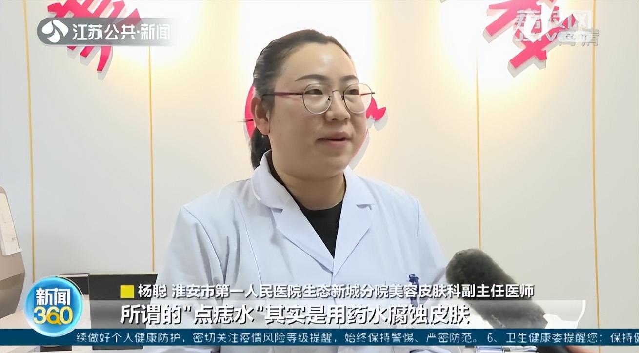 “所谓的‘点痣水’其实是用药水腐蚀皮肤,使痣的皮肤组织坏死然后脱落,一般使用一些具有腐蚀性和细胞毒性的强酸或强碱,如果选用了不合规的药水,有可能导致良性痣的恶变。 ”淮安市第一人民医院生态新城分院美容皮肤科副主任医师杨聪说。
