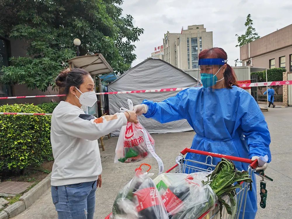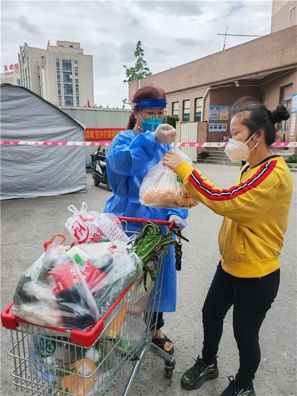 分析了小区的实际情况后,林霞与鼓山镇封控区、管控区六一佳园分指挥部的工作人员一同商讨并确立了配送包栋机制——在封控区外设立分栋物资暂存点,外围志愿者将居民生活物资用推车送至小区门口对接给内围志愿者并推送到对应楼栋,其后通过喇叭呼叫居民错峰下楼取物。