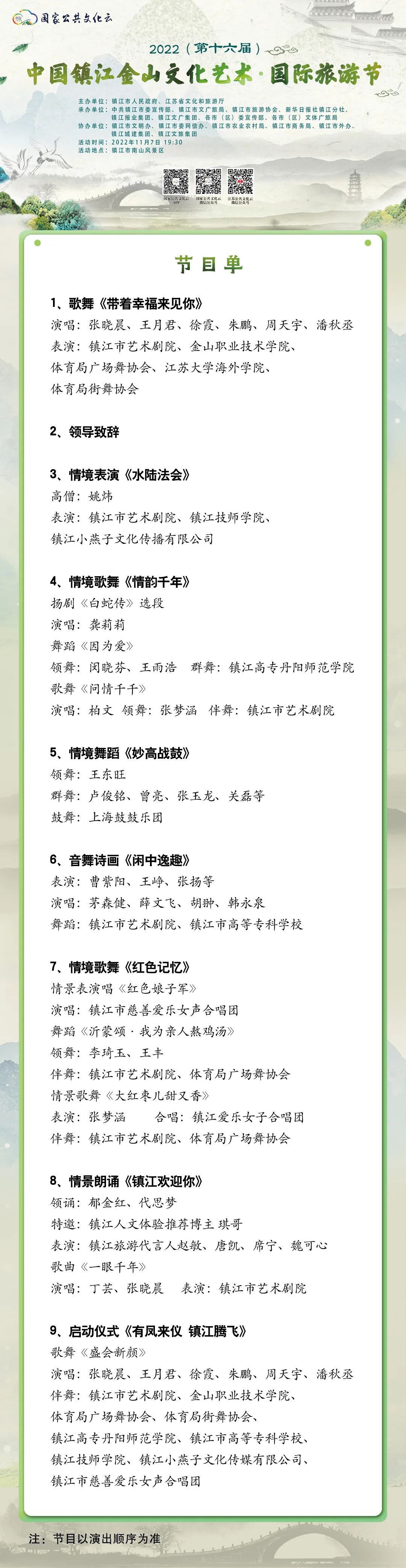 11月7日19:30,2022(第十六届)中国镇江金山文化艺术·国际旅游节开幕式将在镇江南山风景区上演,国家公共文化云将为全程直播。