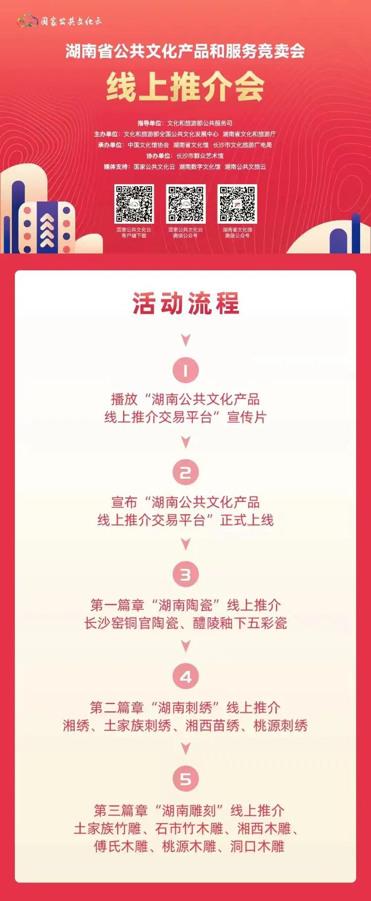 11月8日10:30(直播时间10:40),湖南省公共文化产品和服务竞卖会线上推介会将准时开始,扫码进入国家公共文化云观看精彩直播!