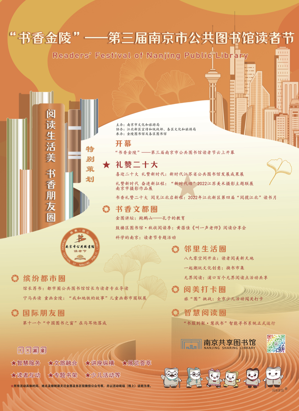 金秋好时节,书香传万家,南京市公共图书馆的读者们又迎来了属于自己的节日。11月4日,由南京市文化和旅游局主办,江北新区宣传与统战部和各区文旅局协办,全市14家公共图书馆共同承办的“书香金陵”——第三届南京市公共图书馆读者节在“云上”拉开帷幕。