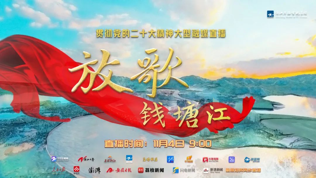 11月4日,《放歌》系列首场大型融媒直播《放歌钱塘江》正式开启。钱塘江全流域六大直播间接力,长达200分钟的大小屏直播,通过多场景互动宣讲、多视角影像呈现、多点位记者蹲点,用“一条大江串起各地新气象”,以浙江上下放歌新时代,奋进新征程的生动故事,展现总书记思想的时代光芒和实践伟力。