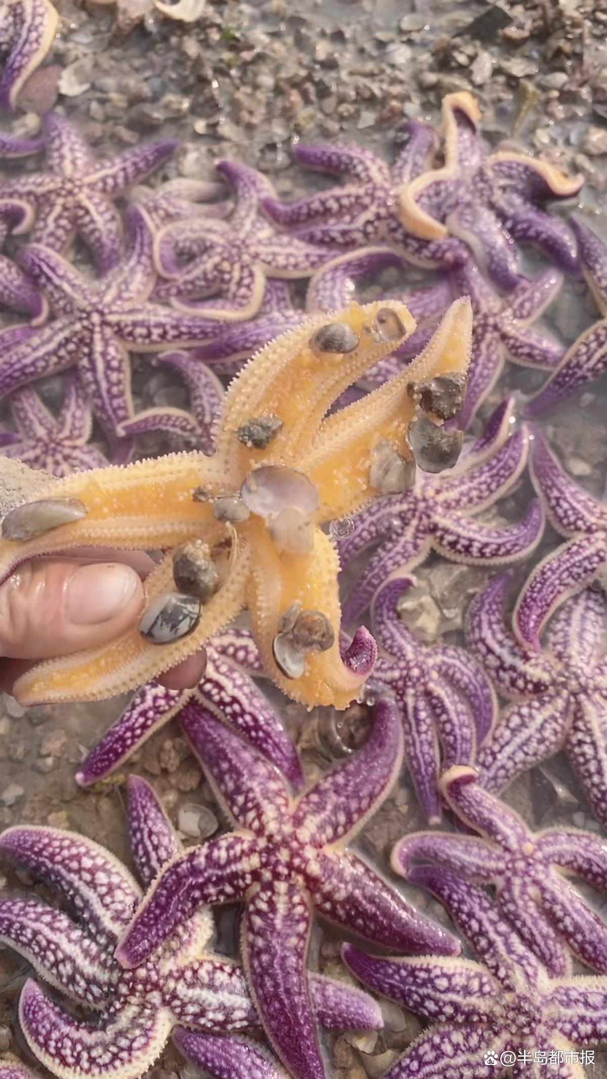 “我在这住了20多年了,几乎每天都来赶海,以前也就能看到几个海星,这么大量的情况太少见了。”高女士告诉极目新闻记者,11月6日上午8时30分许,她像往常一样到青岛市黄岛星光岛二桥附近的海滩赶海,看到了令人吃惊的一幕,“海星密密麻麻的,走路都怕踩到它们,加在一起估计能有几千斤。”