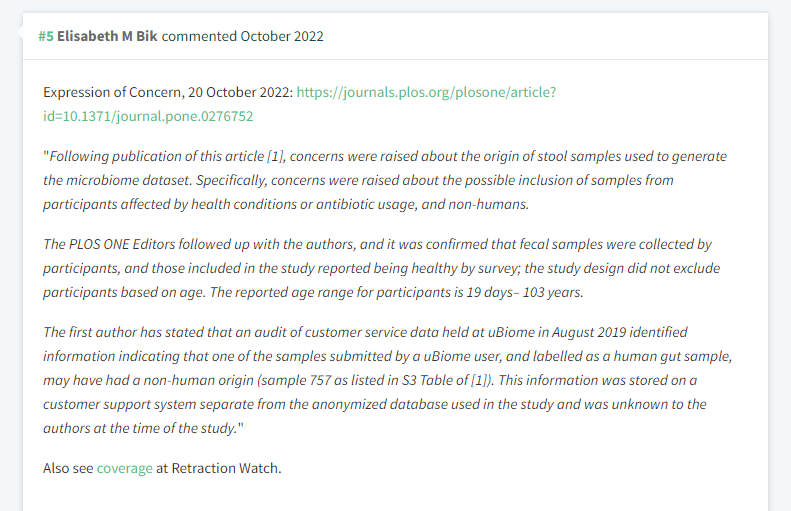 比克指出,这篇文章的数据集可能来自婴儿和宠物的样本,但这类样本不该在这个实验中存在,由此导致临床试验的结果出现问题。