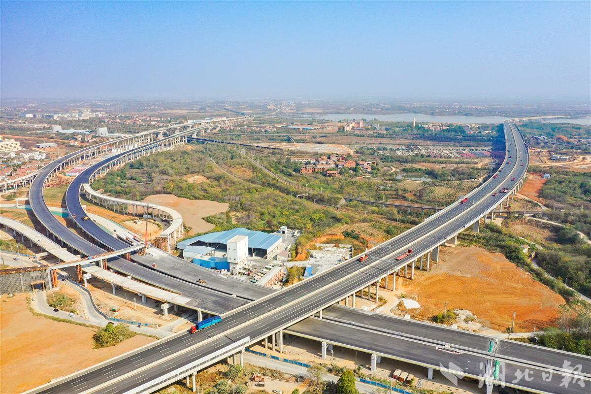 2022年11月7日 ,航拍武汉市黄陂区在建武大高速与武汉四环线交汇处 ,主线高架路面已经刷黑,目前正加紧施工,冲刺年底通车。