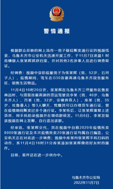 @乌鲁木齐市公安局 11月7日通报,根据群众反映的网上流传一男子疑似贩卖通行证的视频线索,乌鲁木齐市公安机关迅速开展工作,于11月7日凌晨1时将嫌疑人张某辉抓获归案,并对其他3名涉事人员进行调查取证。