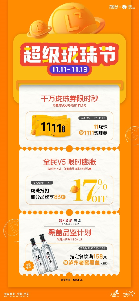 活动1:超级珑珠节,千万珑珠券限时秒,11月11日, 11珑珠秒杀1111珑珠立减券(指定零售品牌,满500元可使用)。数量有限先到先得。