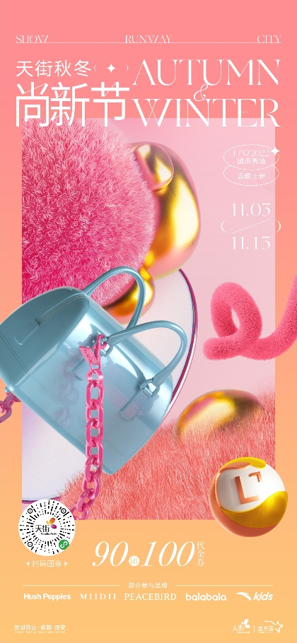 活动4:秋冬尚新节,11月3日-11月13日,龙湖成都天街推出“90团100代金券“活动。