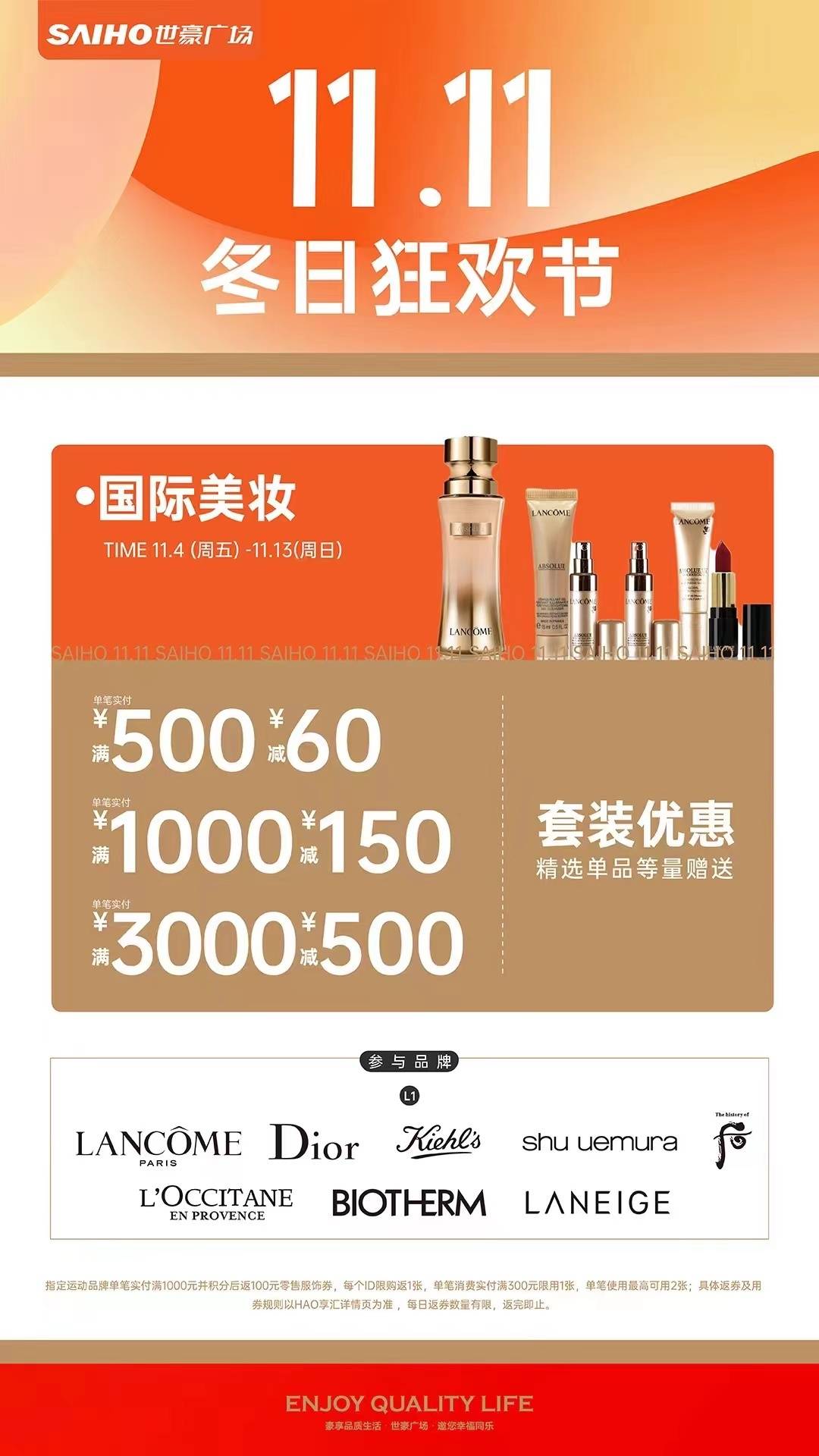 活动1:国际美妆,推出单笔实付满500减60。最高满3000减500的优惠兰蔻、DIOR、植村秀等品牌均参与