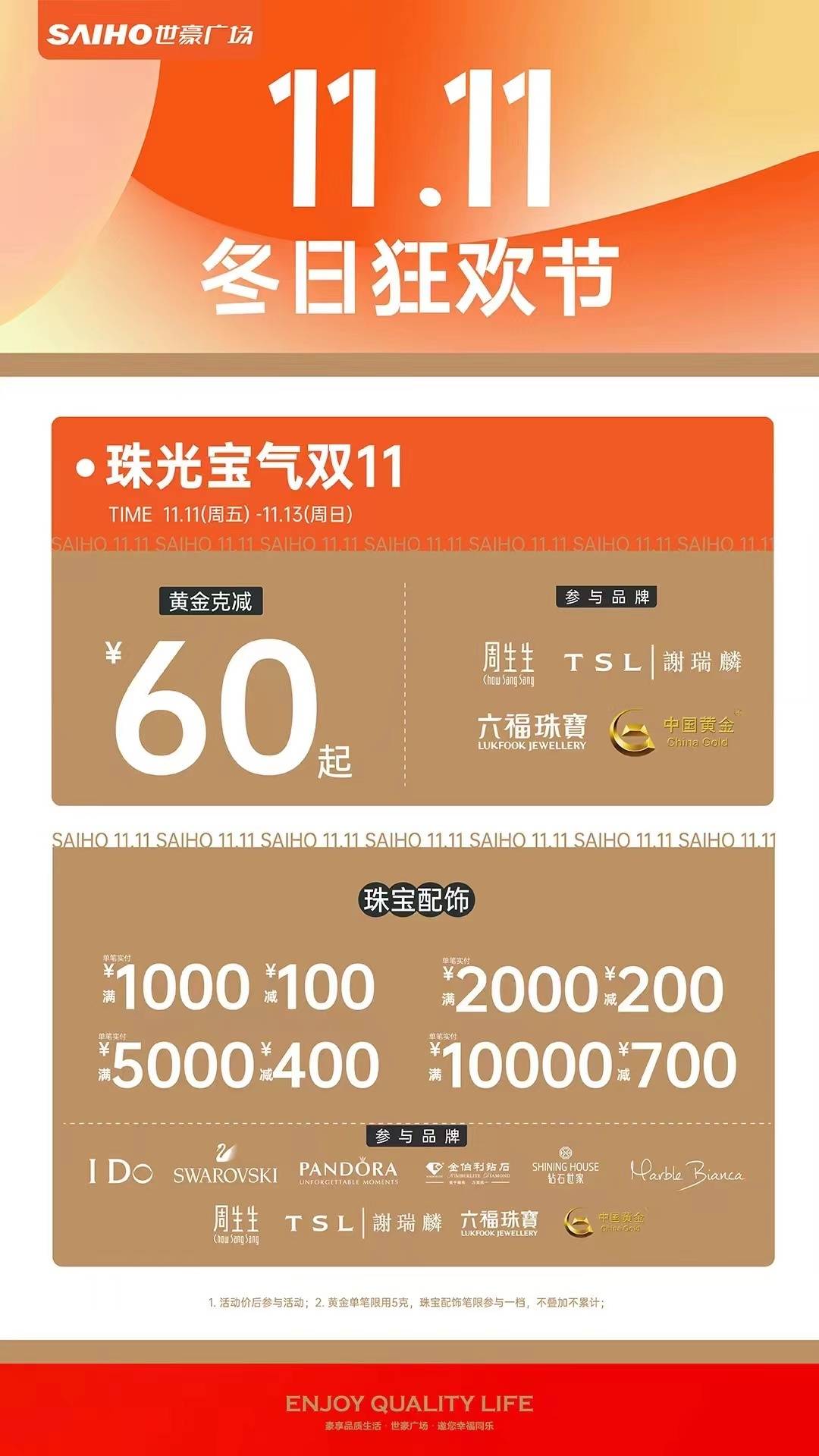 活动2:在珠宝首饰领域,世豪推出黄金每克减60起,周生生、六福珠宝、中国黄金等老牌黄金店都参与活动。珠宝钻石等其他配饰推出满1000减100的活动,最高满10000减700,I Do、钻石世家、周生生、六福珠宝等珠宝大牌也都参与。
