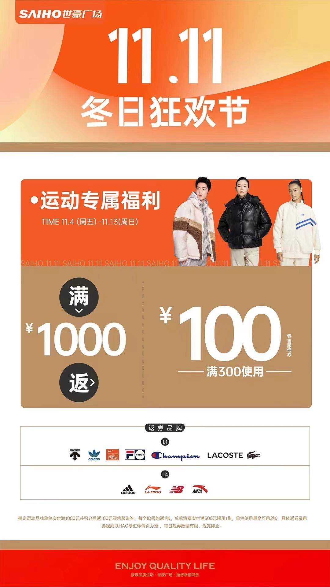 活动3:在服装领域,世豪广场有推出运动专属福利,阿迪达斯、李宁、安踏等运动品牌享满1000返100优惠券等活动,优惠券满300即可使用。