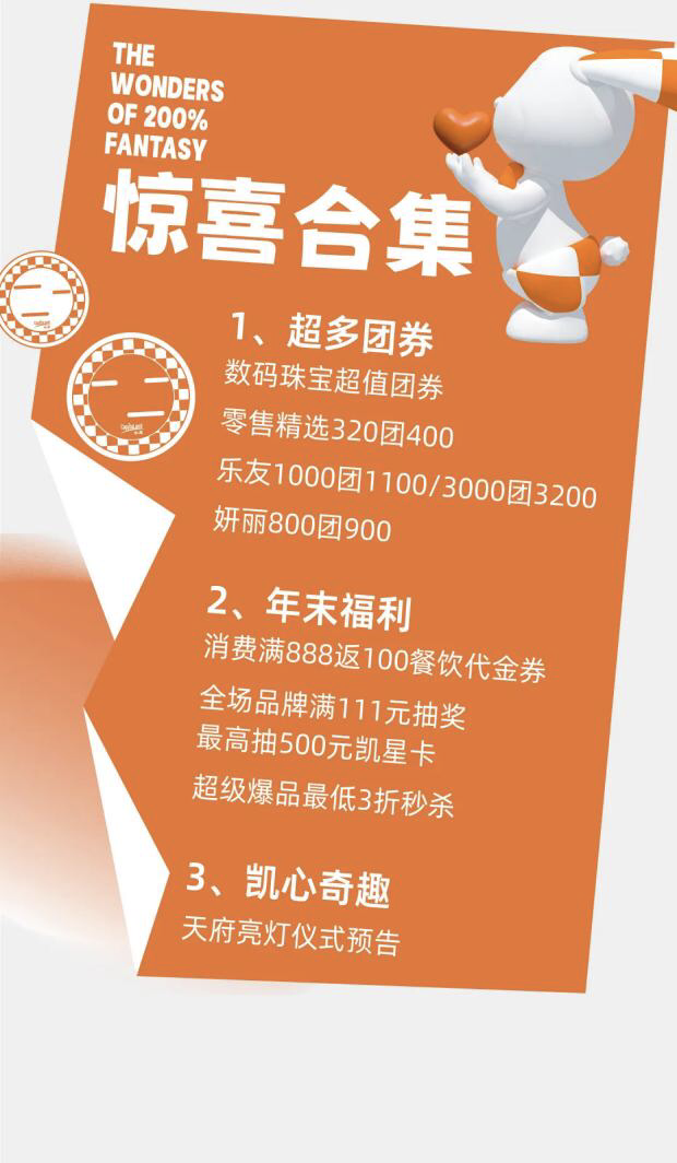 活动2:年末福利,消费满888返100餐饮代金券全场品牌满111元抽奖最高抽500元凯星卡超级爆品最低3折秒杀