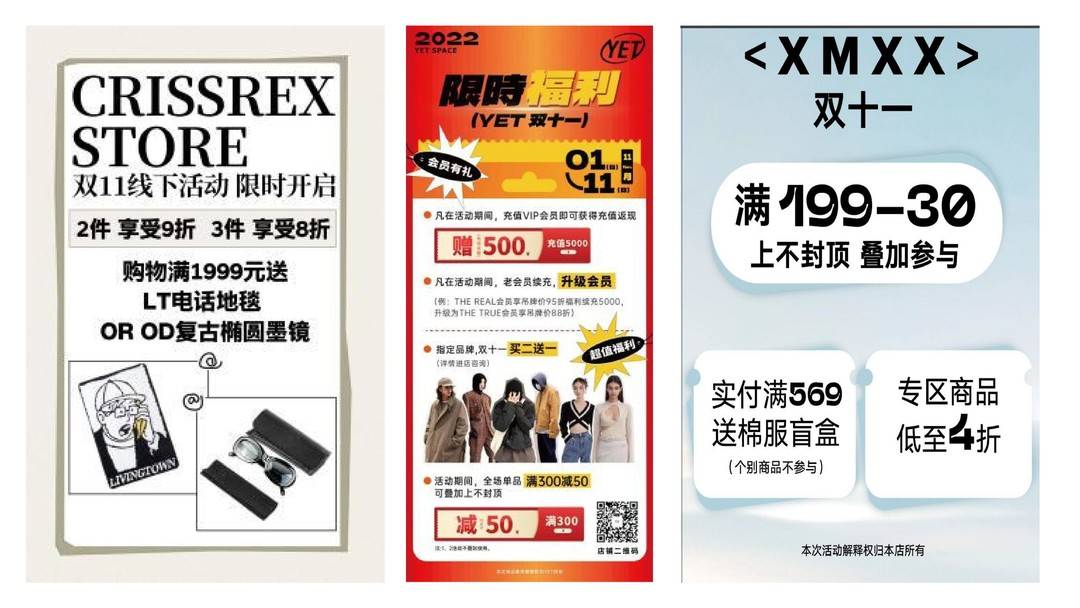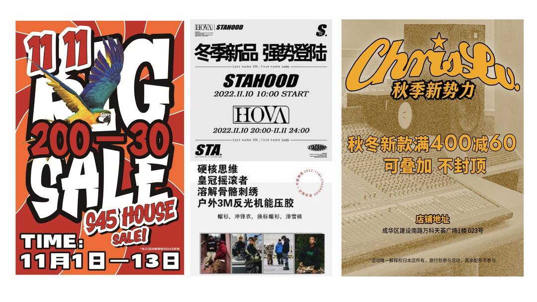 活动1:潮牌折扣,“在街头,冲就完事了”,S45推出全场满200减30,STA冬季新品强势登陆,YET BY 6针对会员推出充值返现、指定款买二送一以及满300减50活动,CRISSREX STORE开启2件九折、3件八折限时折扣,CIM与Candymade也推出限定产品2件九折/三件八折优惠,Chris Lv、