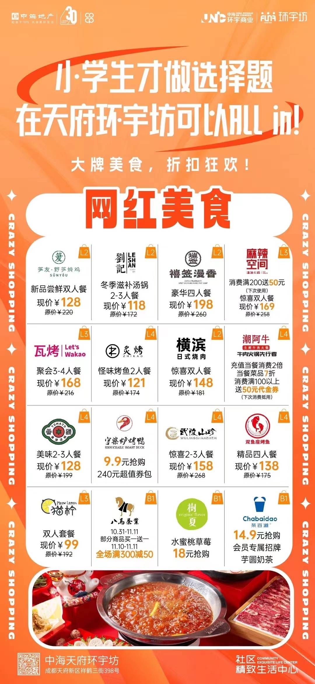 成都中海天府环宇坊也推出了自己的双十一优惠活动——双十一环宇粉丝节!内容十分丰富。没有人能逃脱薅羊毛的快乐!网红美食.元起,精品零售5折起