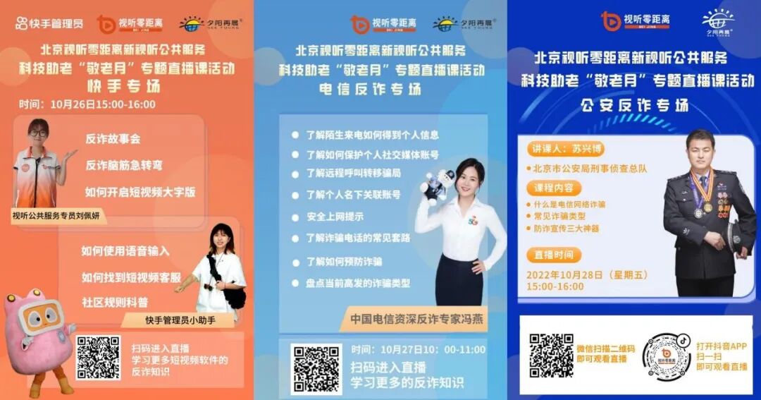 为提高社区老年群体的反诈防骗意识,北京市老龄协会和北京市广播电视局围绕“反诈防骗,敬老助老”主题联合主办北京视听零距离科技助老“敬老月”专题直播课活动,以新视听融媒体传播优势把防诈宣传和帮教服务送到社区居民身边。