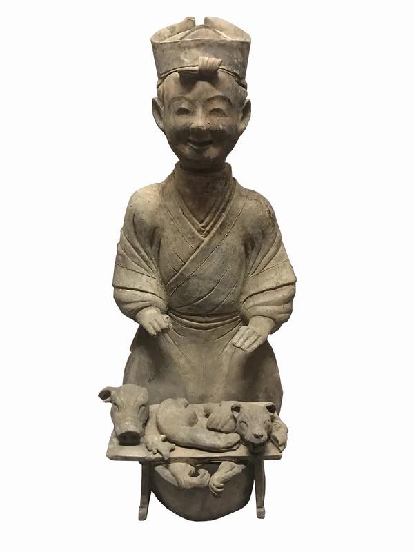 这个眼睛笑成月牙、热爱劳动的陶俑,便是庖人——即为墓主人准备膳食的奴仆。案板上的猪头、带蹄牛腿、鱼等肉类食物,寓意无论生前身后,墓主人都拥有富足的生活和享用不尽的美味。